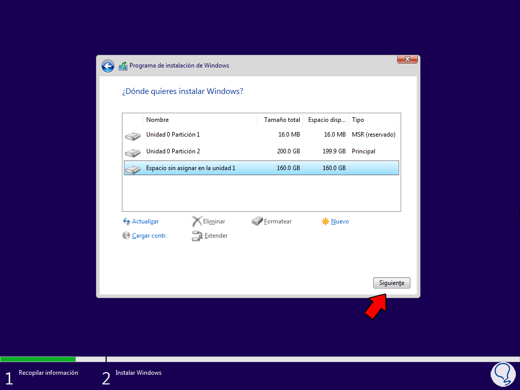 El disco con esquema GPT tiene en la columna GPT el signo *, ahora seleccionamos el disco donde se instalará Windows: