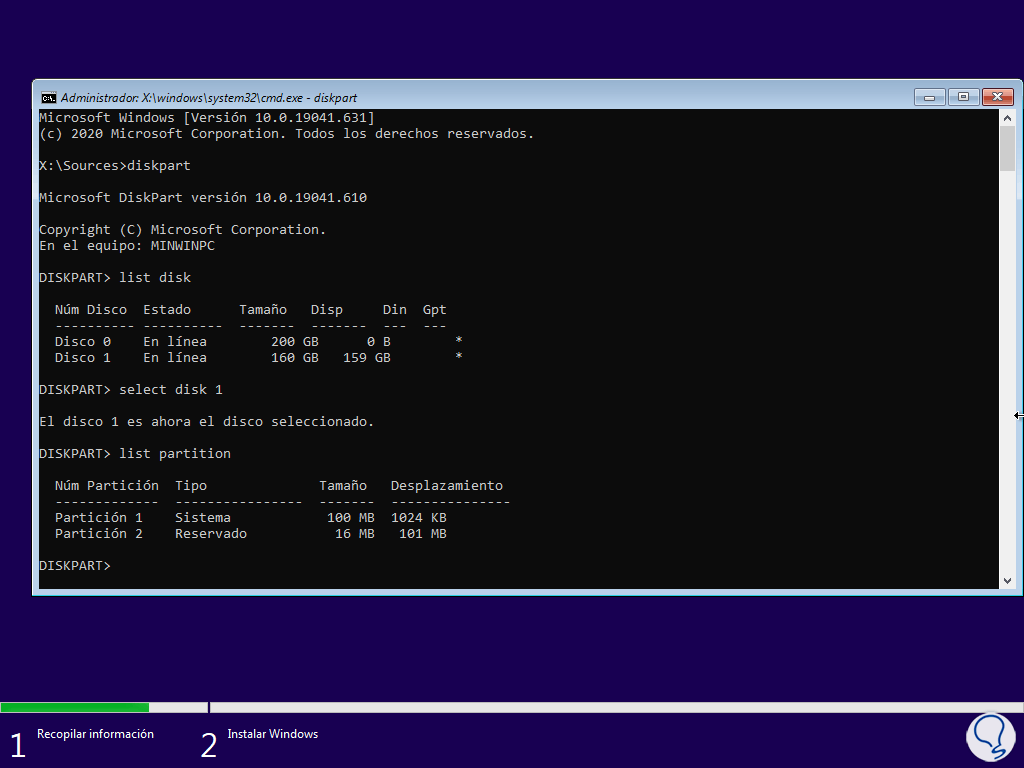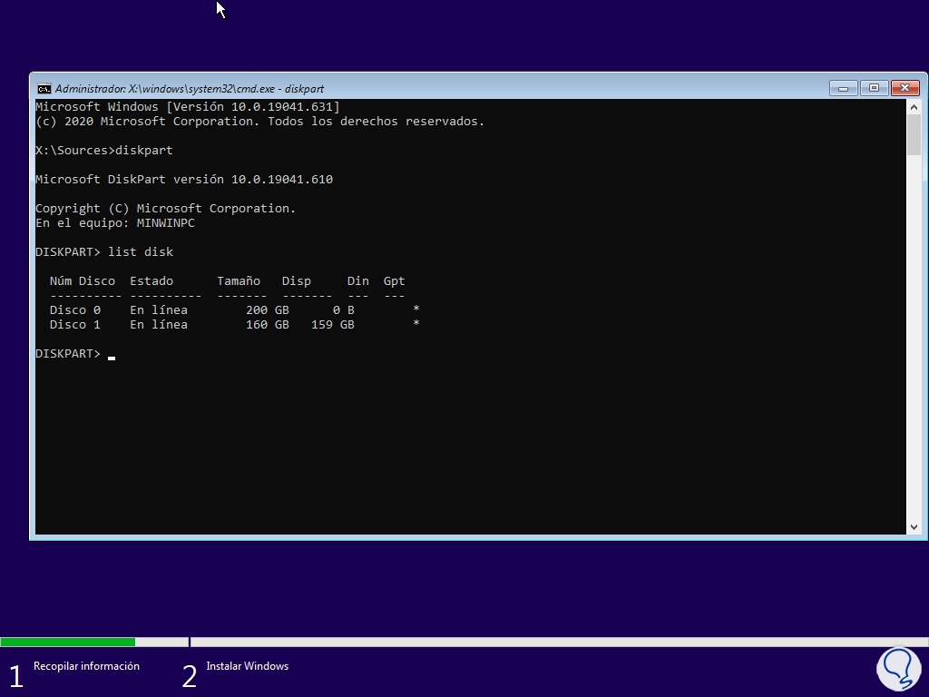 Ejecutamos "diskpart" para acceder a la utilidad de discos y listamos los discos:
