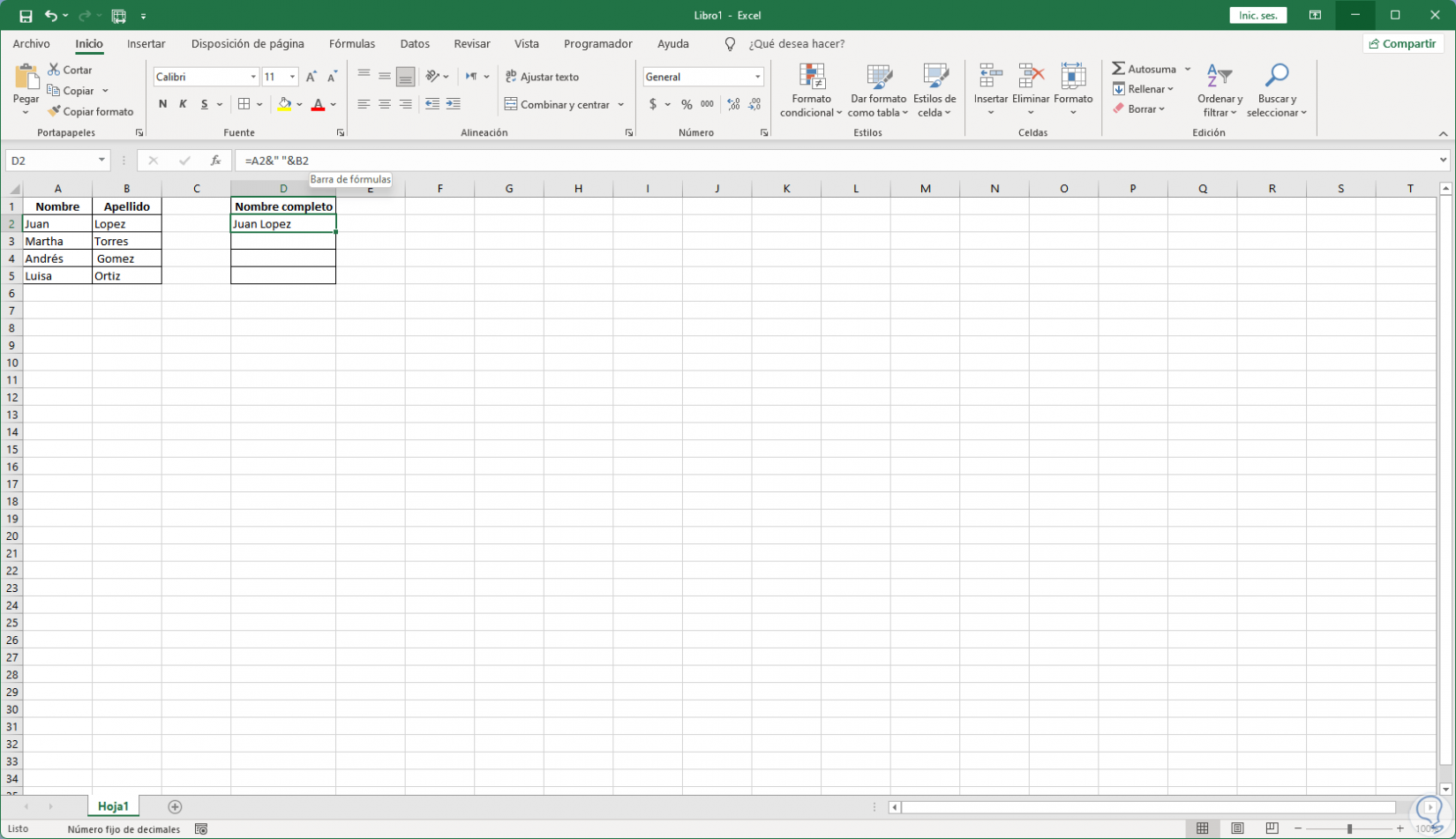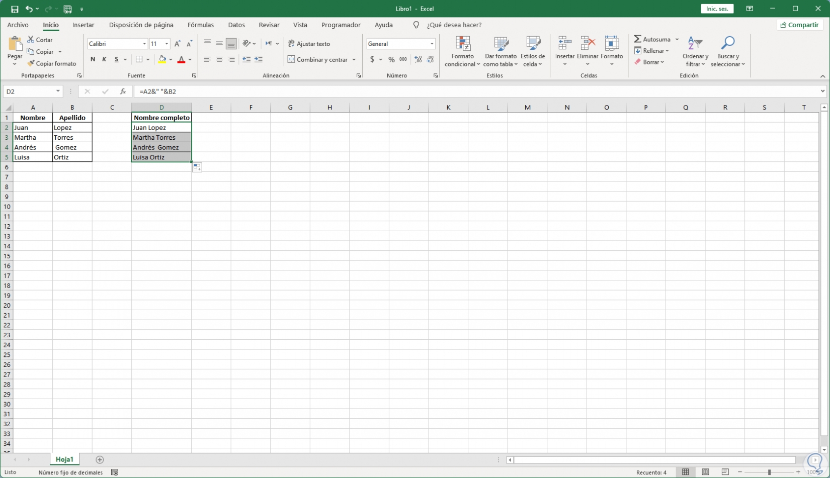 Vemos el resultado con el espacio entre palabras, finalmente arrastramos la celda para copiar la fórmula a las demás: