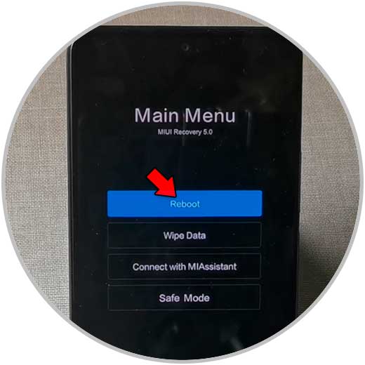 Verás que cuando se enciende, aparece una pantalla de recuperación. Pulsa sobre la opción de “Reboot”. Si te quieres mover entre las opciones utiliza los botones de subir y bajar volumen y la tecla de “Power” para confirmar.