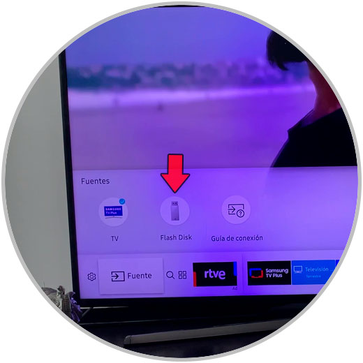 Ahora, utiliza las teclas de flechas del mando para situarte sobre la opción “Fuente”. En la parte superior se desplegarán varias opciones. Pulsa sobre “Flash Disck”.
