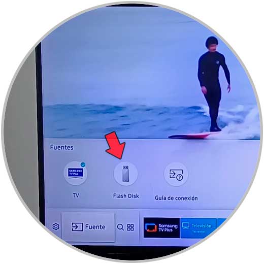 Pulsamos en las flechas del mando para movernos por las diferentes opciones del menú hasta llegar a la opción “Fuente” y se desplegarán opciones sobre éstas. Ahora, pulsaremos en “Flash disk”.