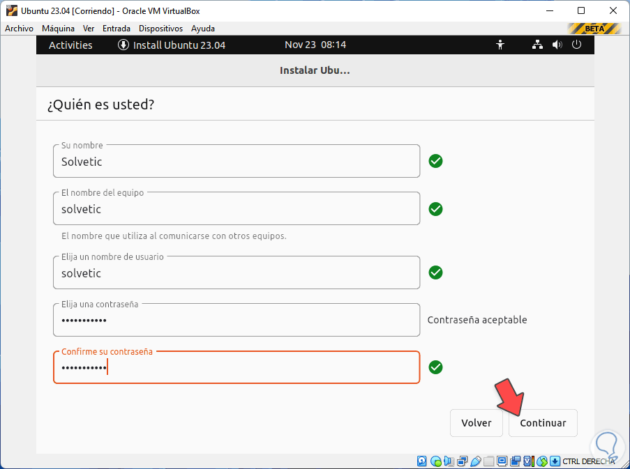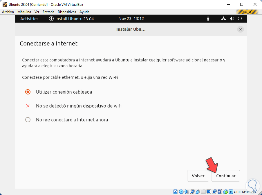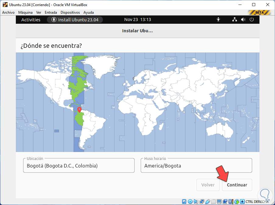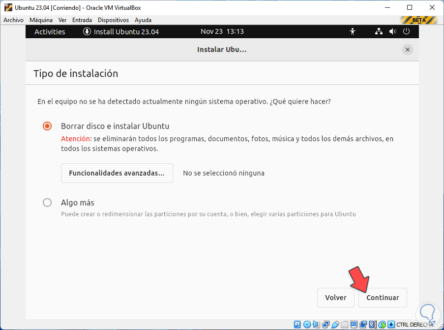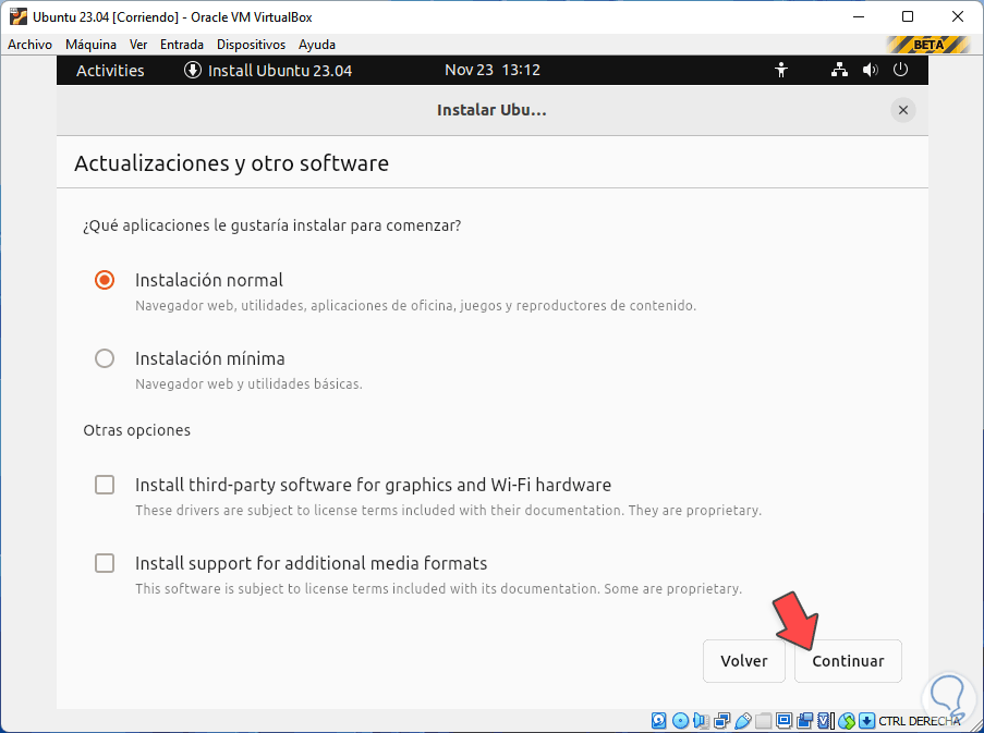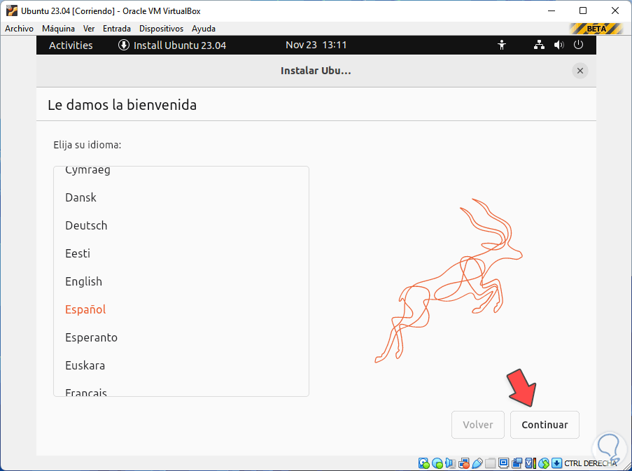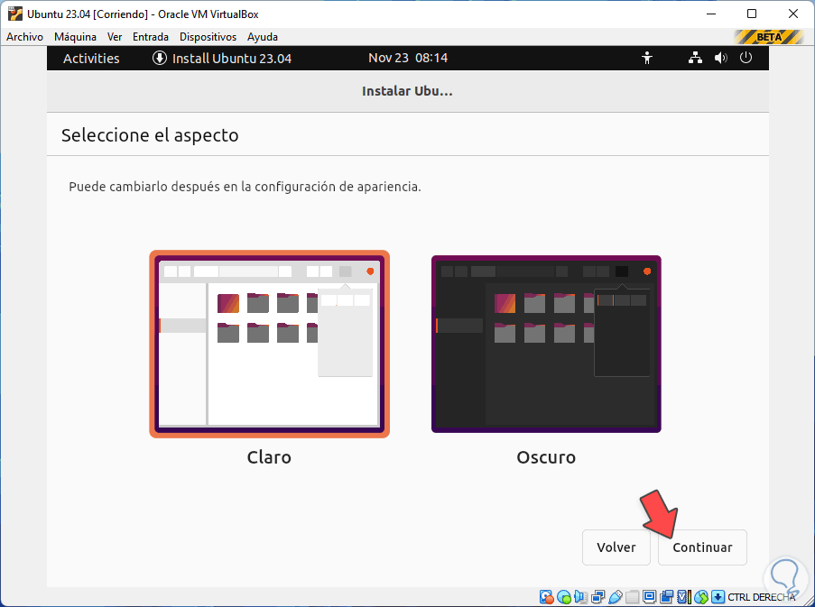 Damos clic en "Continuar" para iniciar la instalación de Ubuntu 23.04: