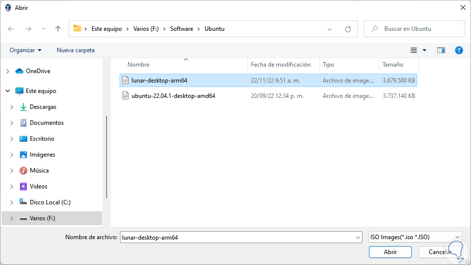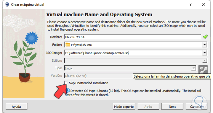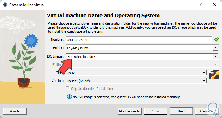 Seleccionamos la imagen ISO de Ubuntu 23.04 (Automáticamente VirtualBox detectará el sistema) dando clic en el botón desplegable de ISO Image: