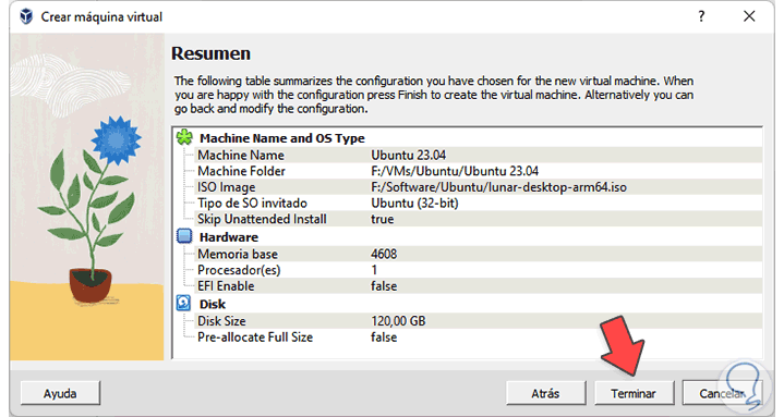 En la siguiente ventana veremos un resumen de la máquina a crear. Da clic en "Terminar" para ver la máquina de Ubuntu 23.04: