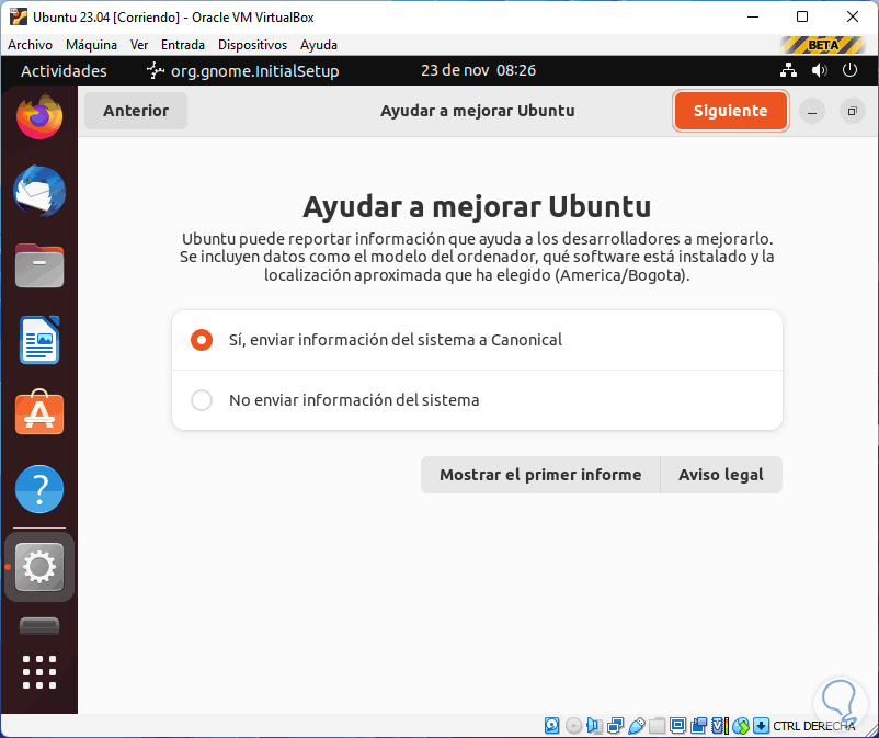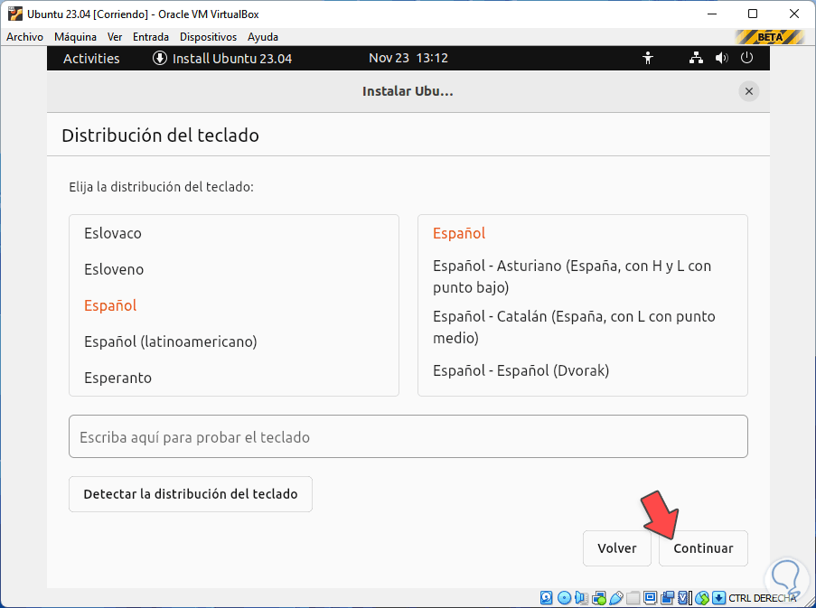 Recordemos que es posible probar el sistema pero todos los cambios se perderán al cerrar la sesión, luego definimos el idioma del teclado: