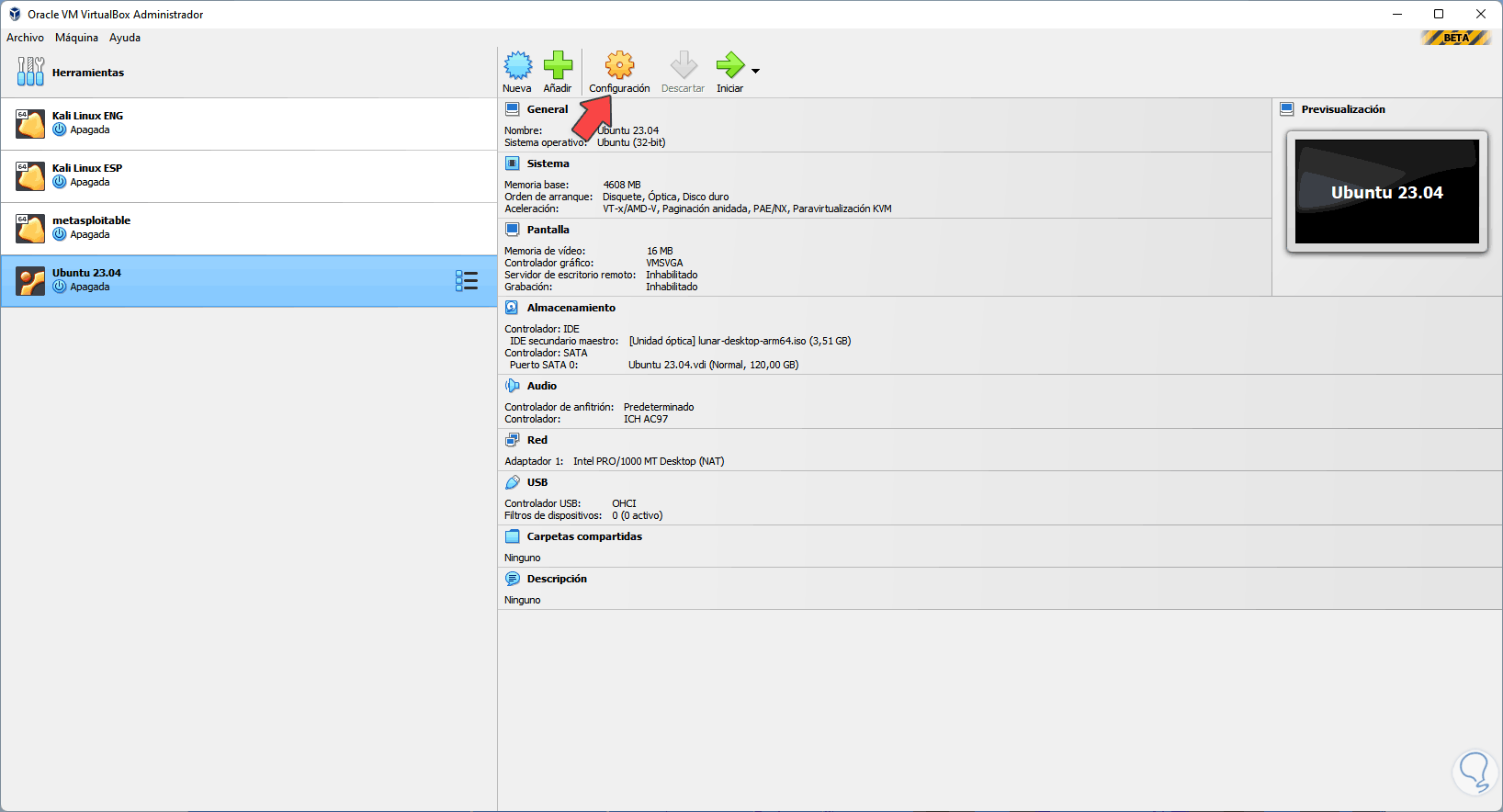 Damos clic en "Configuración" para ajustar los parámetros necesarios de la máquina virtual: