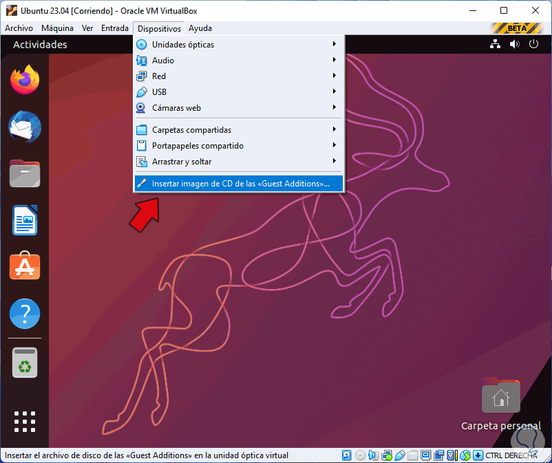 Ahora vamos a Instalar las Guest Additions las cuales permiten una total interacción entre el equipo físico y la máquina virtual, para ello vamos a "Dispositivos - Instalar Imagen de CD de las <<Guest Additions>>":