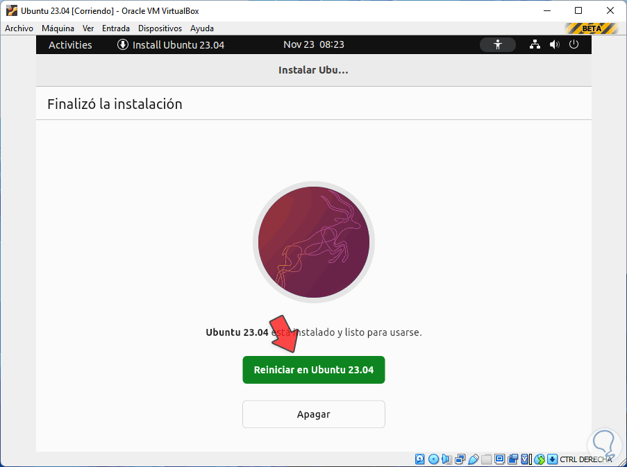 Esperamos que finalice la instalación y al finalizar damos clic en "Reiniciar en Ubuntu 23.04":