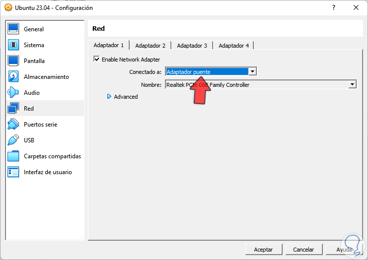 Establecemos “Adaptador puente” para permitir la conexión con la máquina virtual: