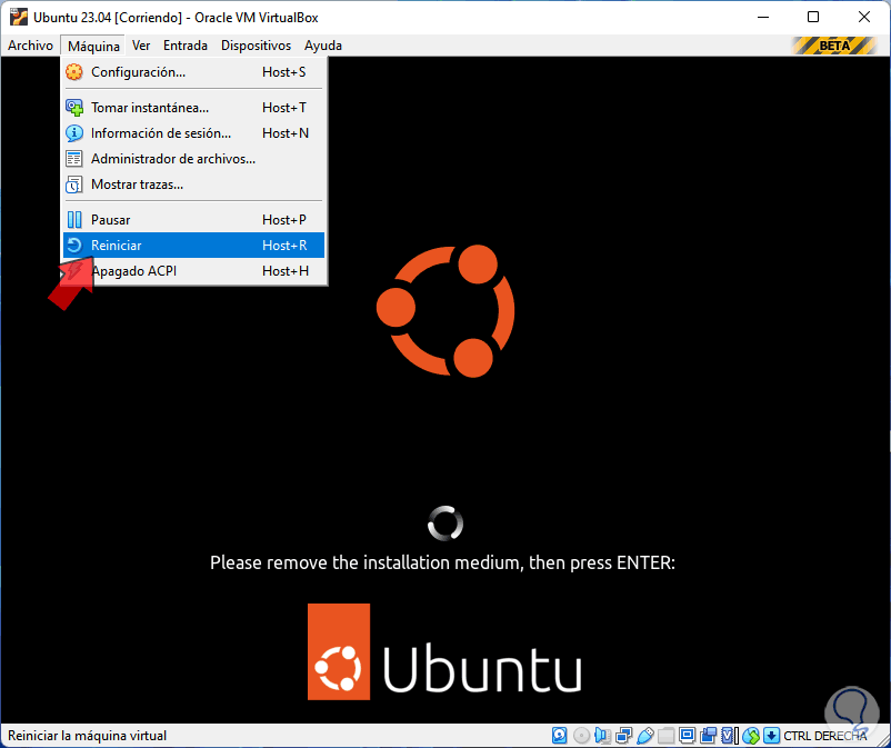 Al reiniciar salta el error de que esta el medio de instalación, para evitarlo vamos a "Máquina - Reiniciar" para cargar el arranque normal: