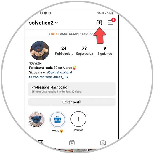 Desde tu perfil de Instagram, pulsa en el icono “+” en la esquina superior derecha.