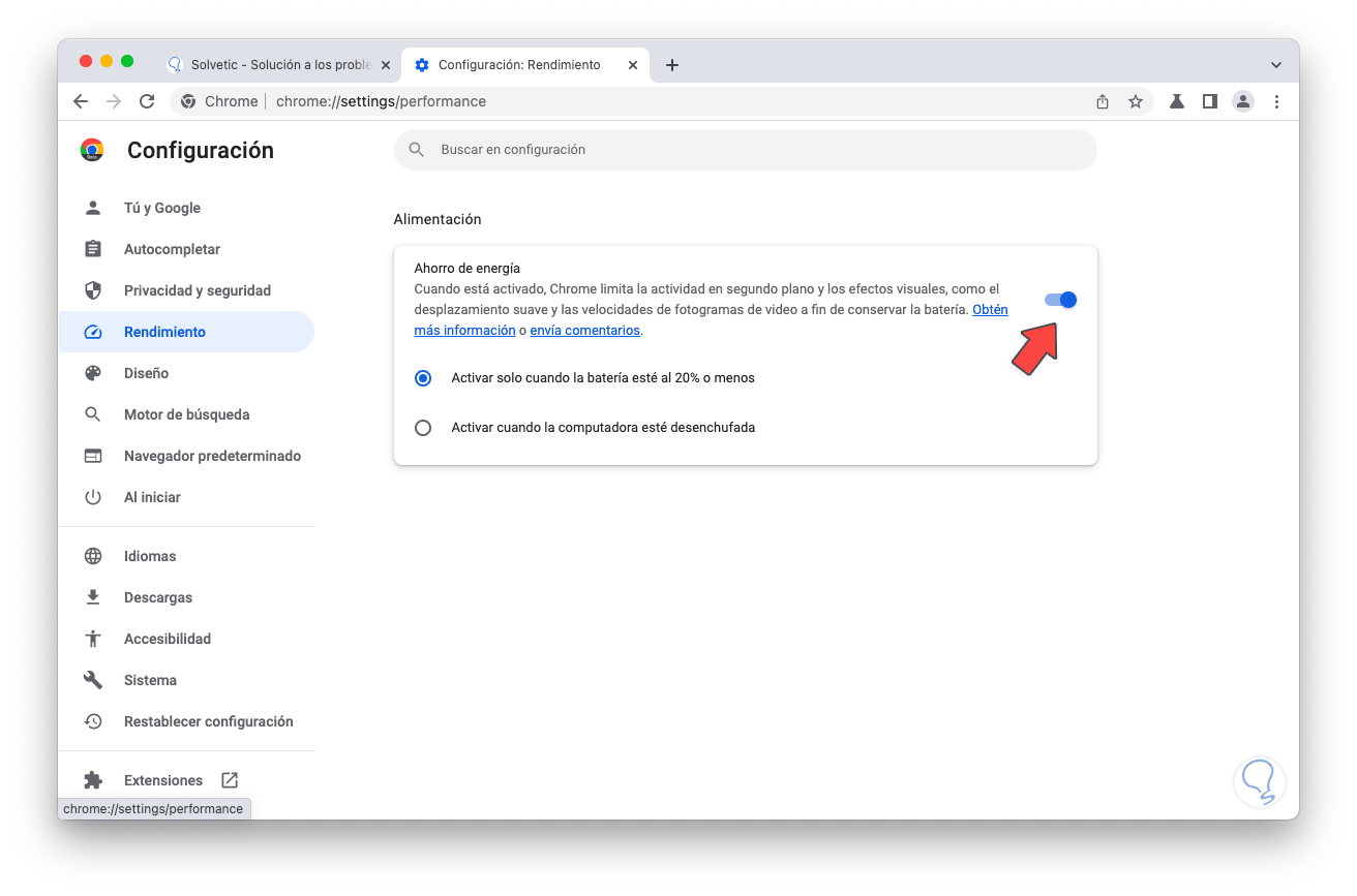 En la sección "Rendimiento" es posible configurar el ahorro de batería en el navegador: