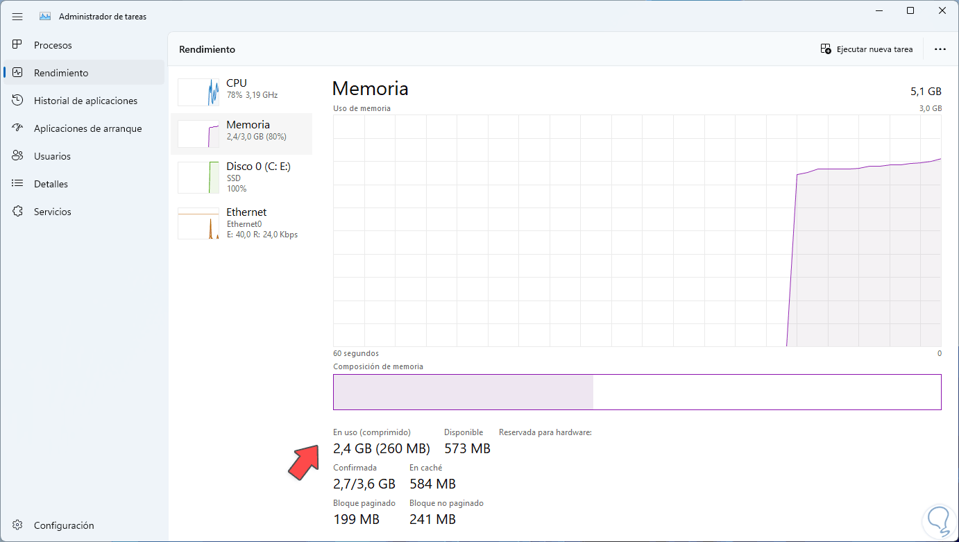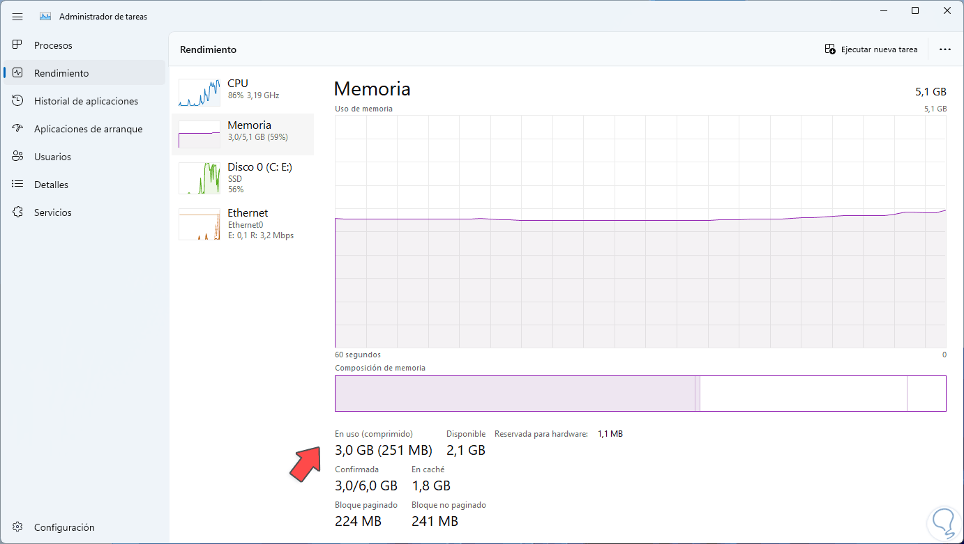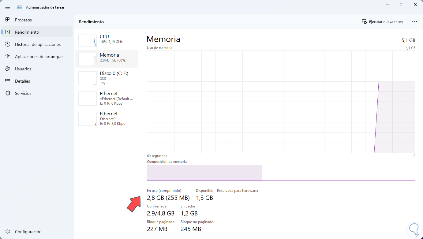 En "Rendimiento" vamos a la sección "Memoria" y allí determinamos que no se usa el total de la RAM: