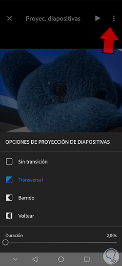 También tendremos un menú de tres puntos sobre el que si pulsamos veremos opciones de proyección de diapositivas como transiciones y duración.