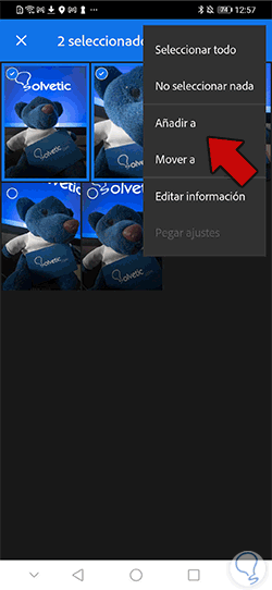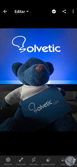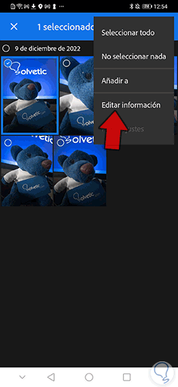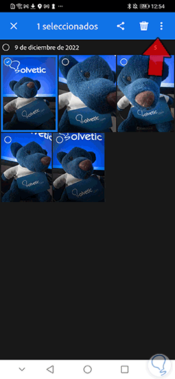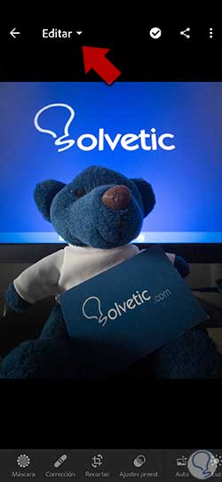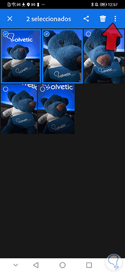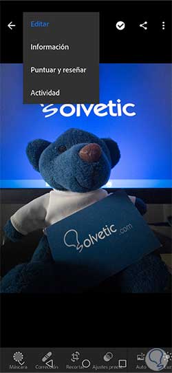 Para ello mantén pulsado sobre la imagen a editar y después sobre el menú de tres puntos superior derecho, importante que sea de la barra de color azul.