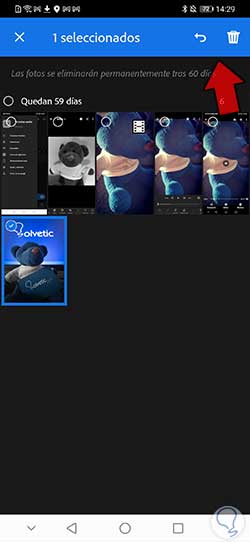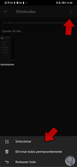 En caso de querer restaurar o eliminar definitivamente todas las imágenes a la vez, pulsaremos en el menú de tres puntos superior y veremos las opciones disponibles de acción en la parte inferior.