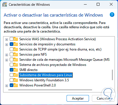 En la ventana emergente ubicamos la línea "Subsistema de Windows para Linux":