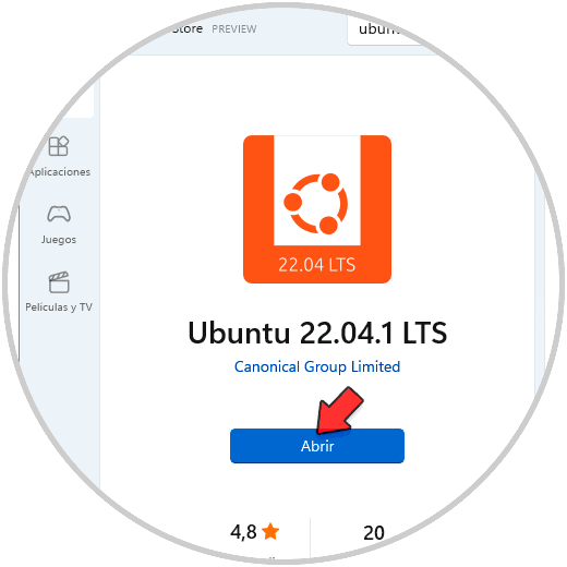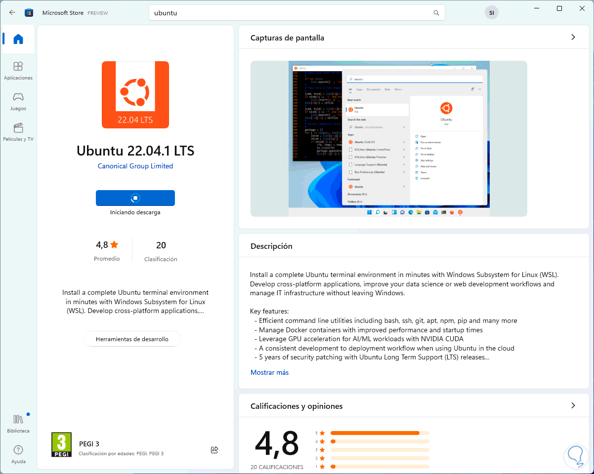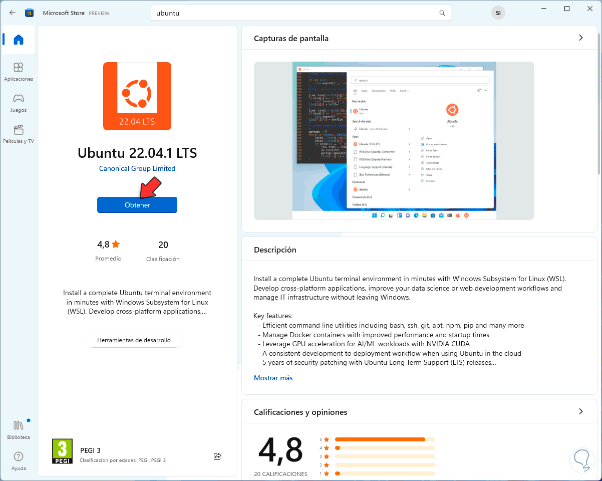 Al iniciar sesión abrimos la Tienda de Windows y buscamos Ubuntu: