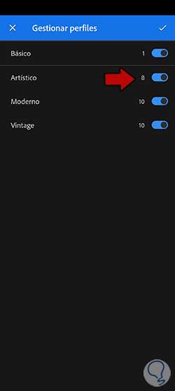 Aquí podremos activar o desactivar con el interruptor azul las categorías de perfiles que queremos en nuestro menú. Ten en cuenta que se mostrarán los perfiles actuales, es decir, si en el filtrado anterior hemos ocultado los perfiles en blanco y negro, ahora no se mostrarán para ser gestionados.