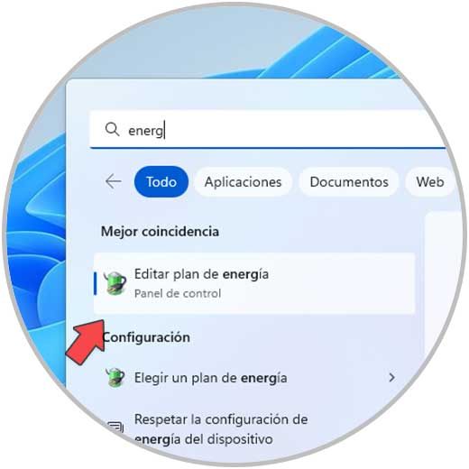Para crear este plan en el buscador de Inicio ingresamos "energía" y damos clic en "Editar plan de energía":