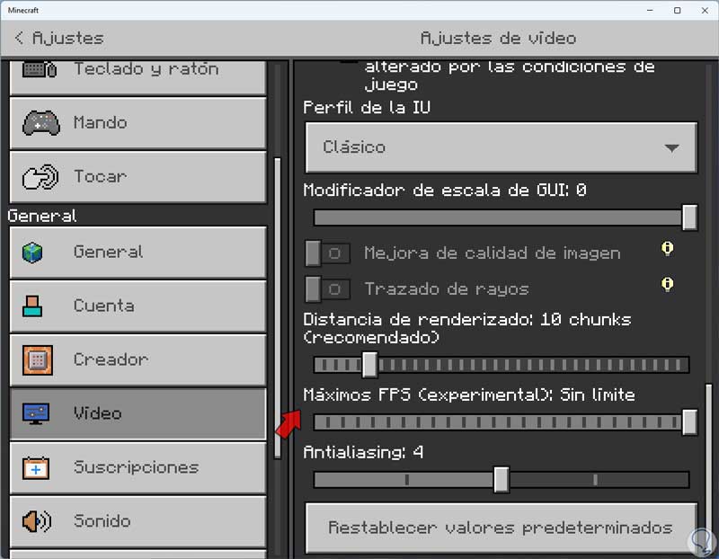 Damos clic en "Ajustes" y en la sección "Video" es posible ajustar los FPS y demás variables asociadas a este:
