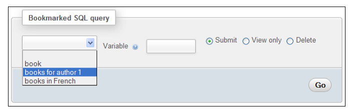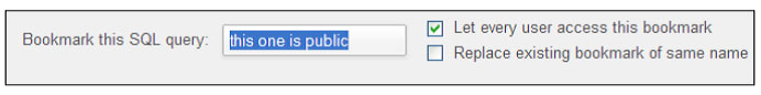 Esta opción nos permite almacenar una consulta así no tenga resultados, puede ser una consulta sencilla o cualquier otra operación sobre nuestras tablas. En las vistas SQL tanto de Base de Datos como de Tablas, tenemos un cuadro que dice bookmark this SQL query, ahí podremos colocar el nombre de nuestra etiqueta justo antes de ejecutar las consultas; una vez ejecutada la consulta el bookmark es almacenado, por lo que podemos guardar todas las operaciones que necesitemos, ya sean Insert, Select, Delete, Update, Create Table, etc.