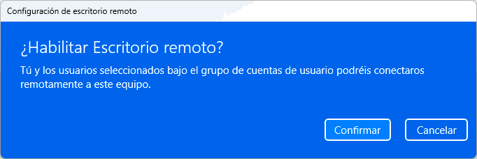 Damos clic en “Confirmar” para activar el Escritorio remoto: