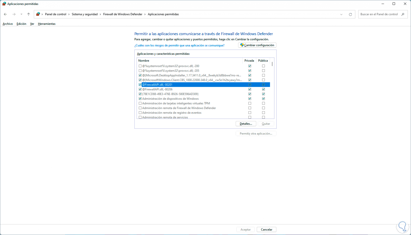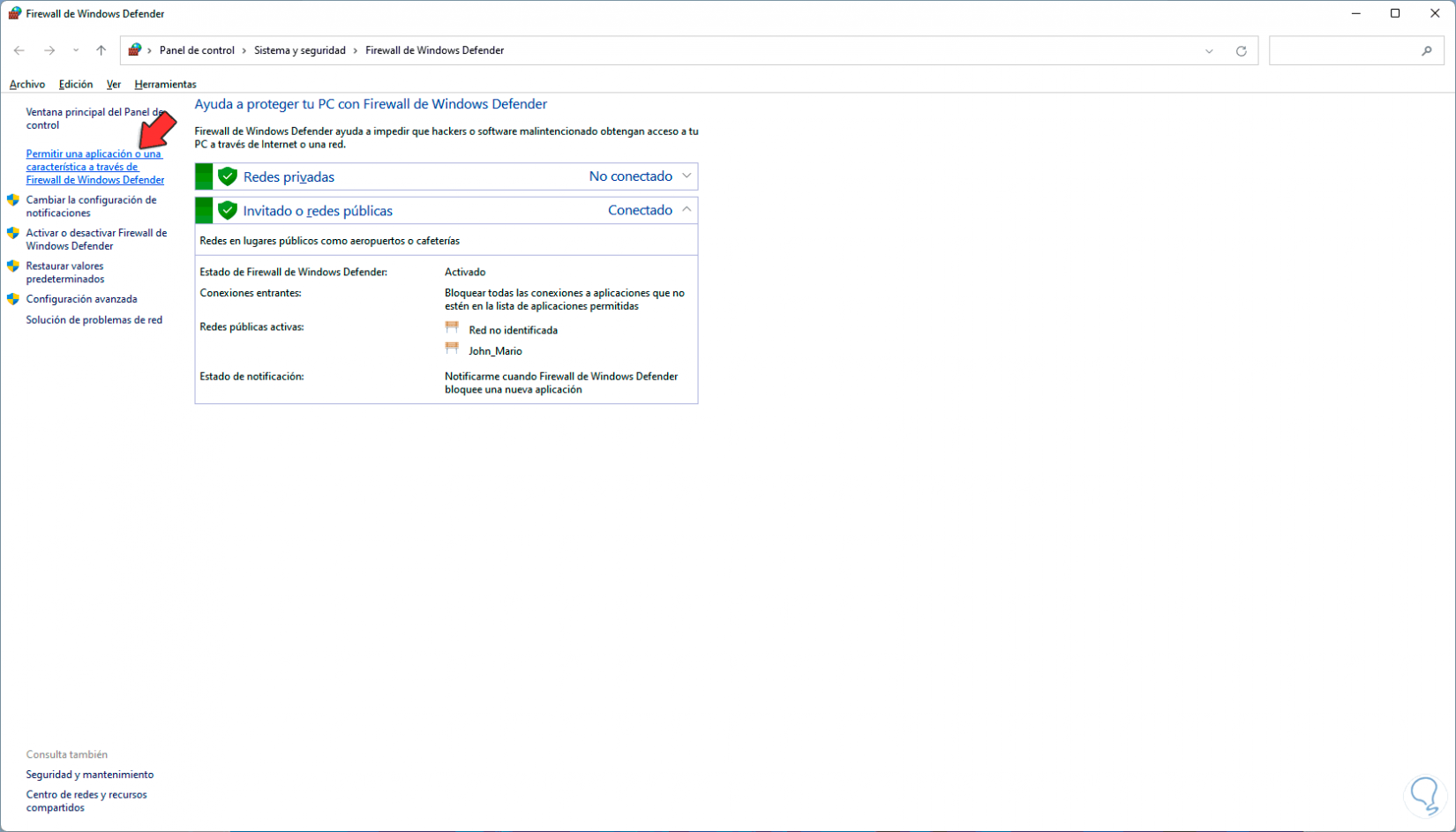 Luego damos clic en "Permitir una aplicación o una característica a través de Windows Defender":