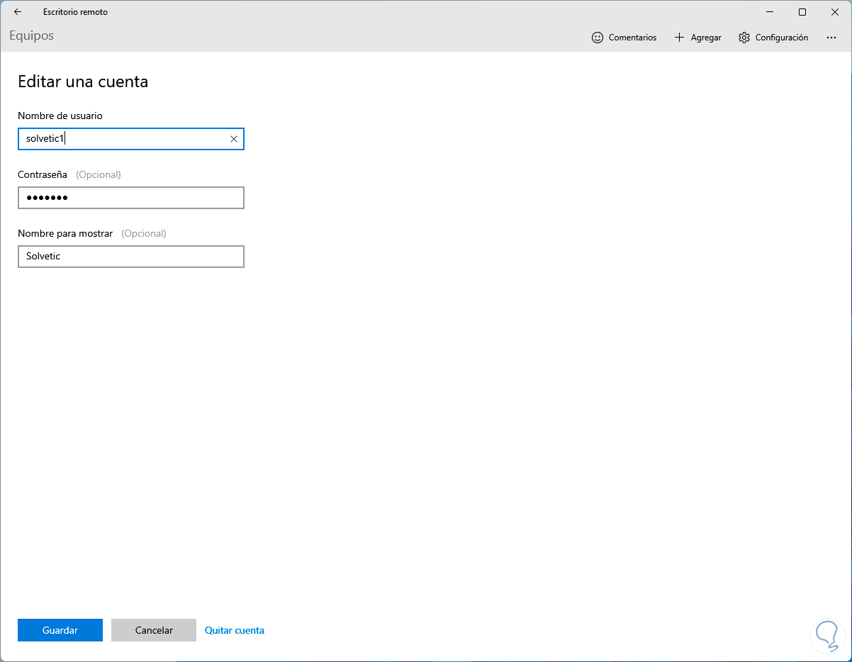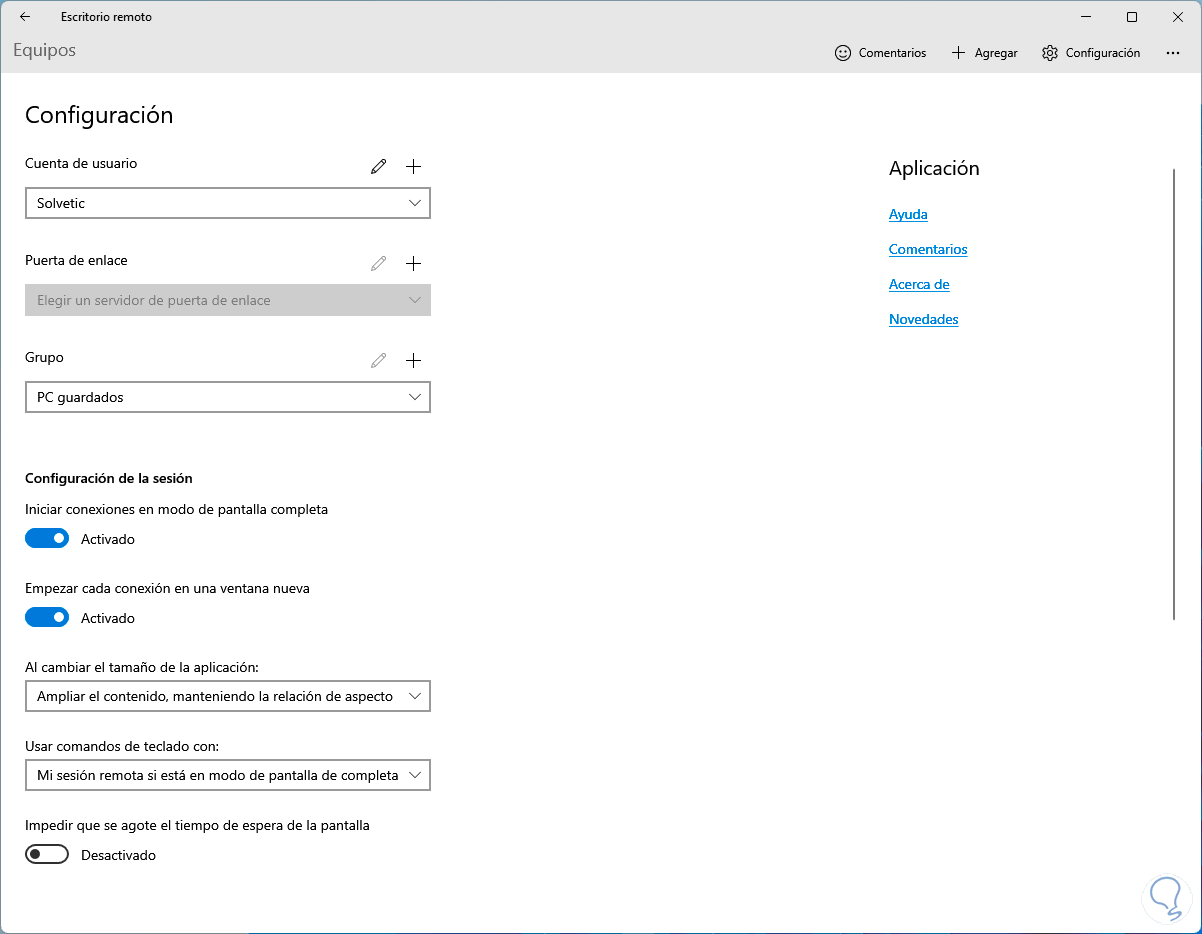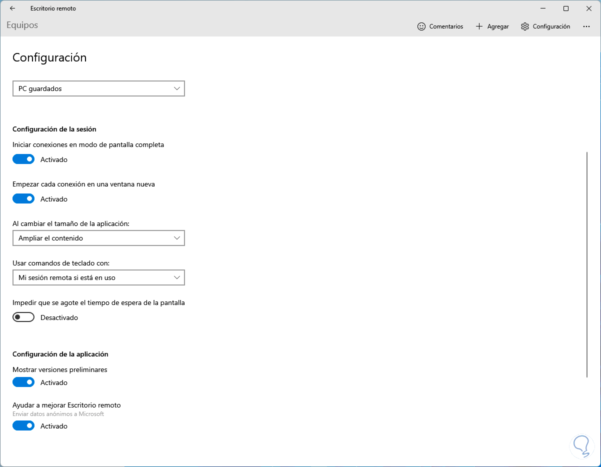 En la aplicación Escritorio Remoto damos clic en "Configuración" y será posible editar todas las variables de la aplicación y las máquinas remotas: