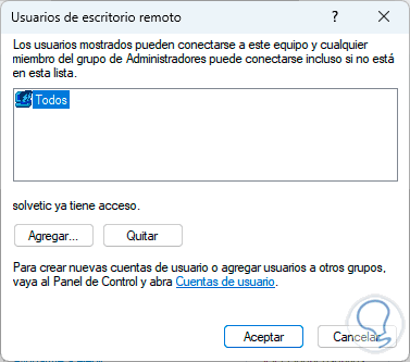 Veremos el nombre del PC para poder establecer la conexión y damos clic en "Usuarios de Escritorio remoto" para seleccionar que o quienes tendrán acceso, se abrirá la siguiente ventana: