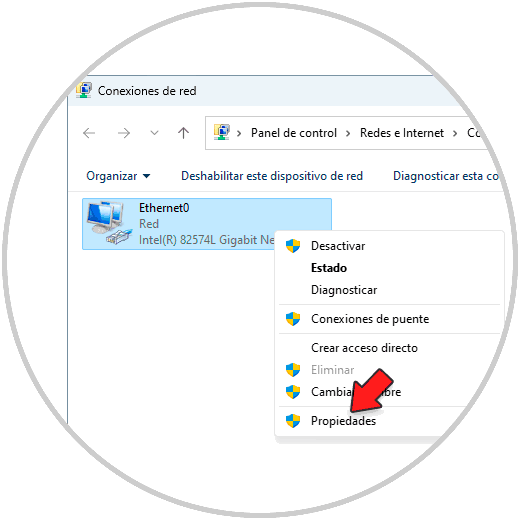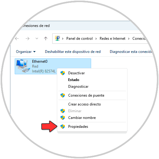 Ahora en el buscador de Inicio ingresamos "red" y damos clic en "Ver conexiones de red", luego damos clic derecho sobre el adaptador y seleccionamos "Propiedades":