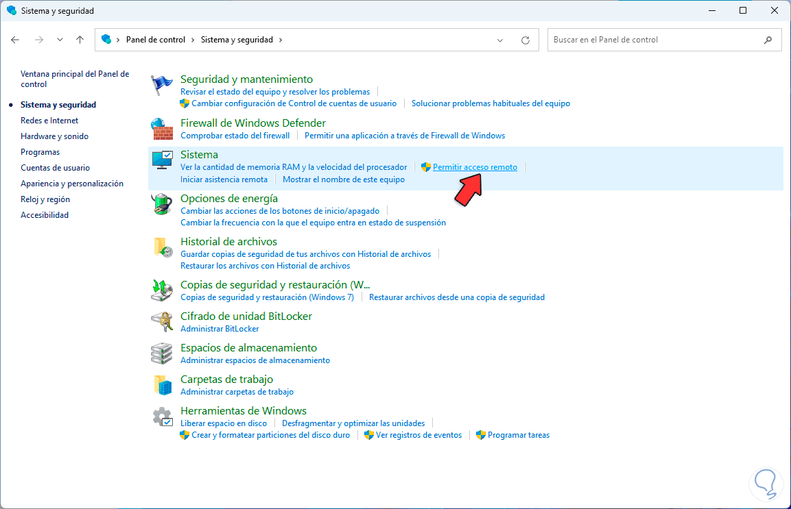 Vamos a "Sistema y seguridad - Permitir acceso remoto":