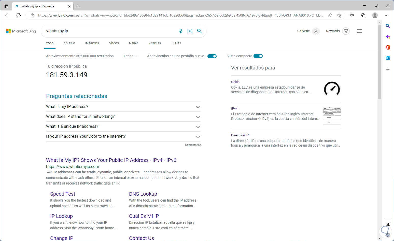 Como un punto adicional es posible que se desee realizar la conexión desde afuera de la red local, en este caso será necesario conocer la IP publica, para ello se puede usar algún navegador e ingresar, por ejemplo, Whats m yip: