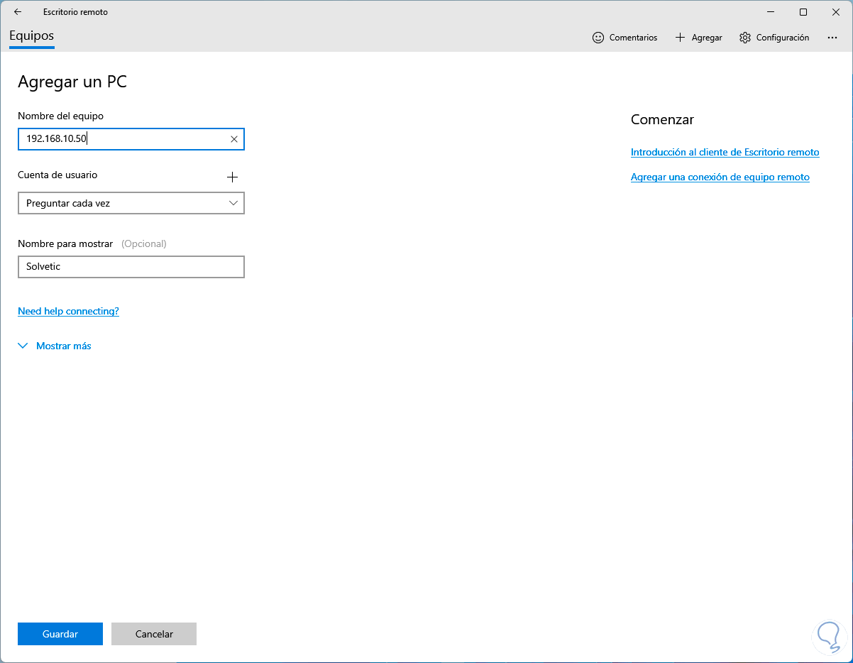 Damos clic en "Guardar" para almacenar la máquina remota: