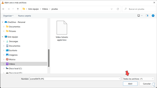 Elegimos la ubicación de nuestro archivo y lo abrimos. Para poder encontrarlo tendrás que activar la opción de “Todos los archivos” en la ventana inferior derecha.