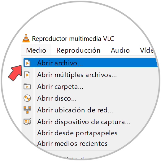 Abrimos VLC una vez instalado. Hacemos clic sobre “Medio – Abrir archivo” o la siguiente combinación:
