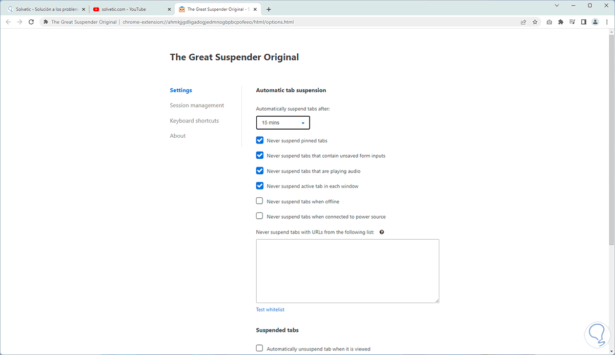 Activamos la casilla “Automatically unsuspend tab when it is viewed" para que si esa pestaña esta en uso no sea suspendida.
