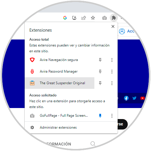 Una vez instalada, damos clic en el icono de extensiones y luego clic en "The Great Suspender Original":