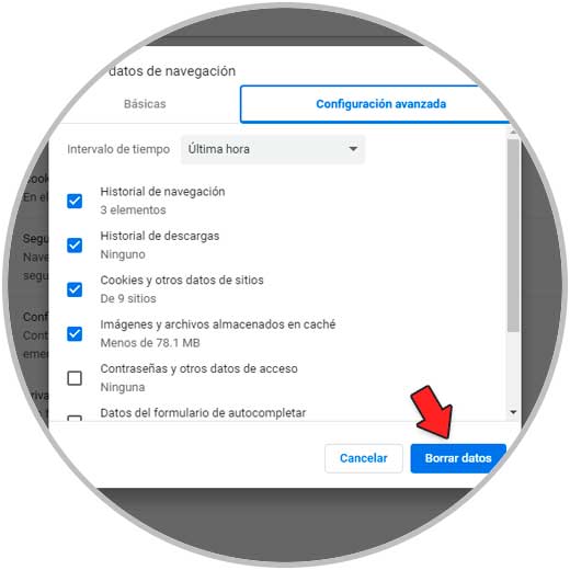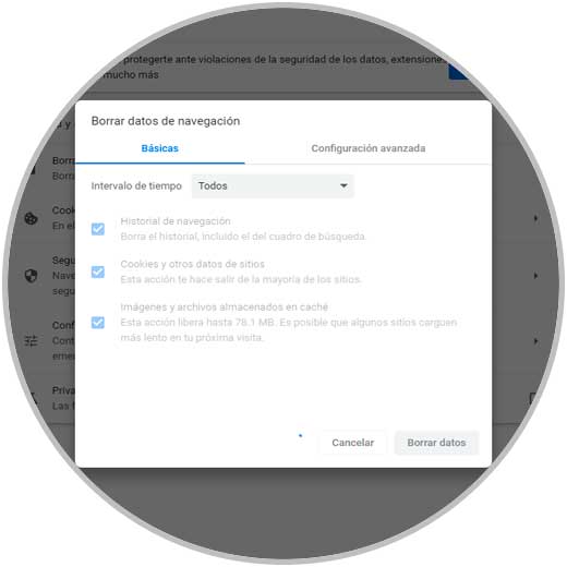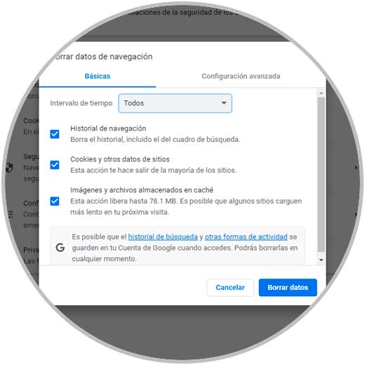 Activamos las casillas deseadas, en "Intervalo de tiempo" seleccionamos el periodo deseado o "Todos" y luego damos clic en "Borrar datos" para proceder: