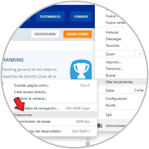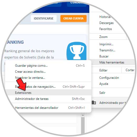 Para acceder a las extensiones abrimos Google Chrome y vamos a "Personalizar y controlar Google Chrome - Más herramientas - Extensiones":