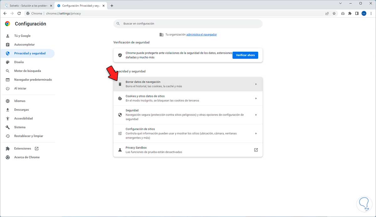 En "Privacidad y seguridad" damos clic en "Borrar datos de navegación":