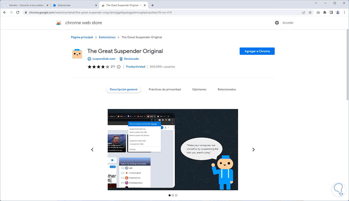 Esta función permite en un determinado tiempo suspender la actividad de una pestaña si no estamos trabajando en ella, instalaremos una extensión.
