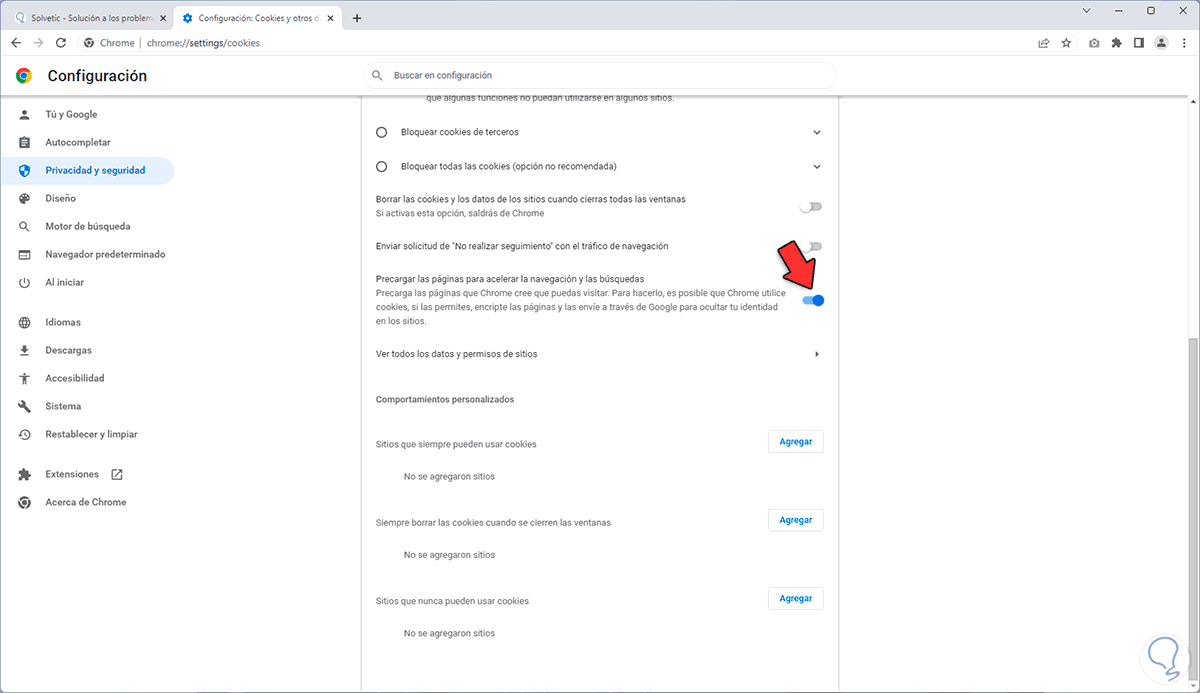 Luego confirmamos que el interruptor "Precargar las páginas para acelerar la navegación y las búsquedas" esté activo: