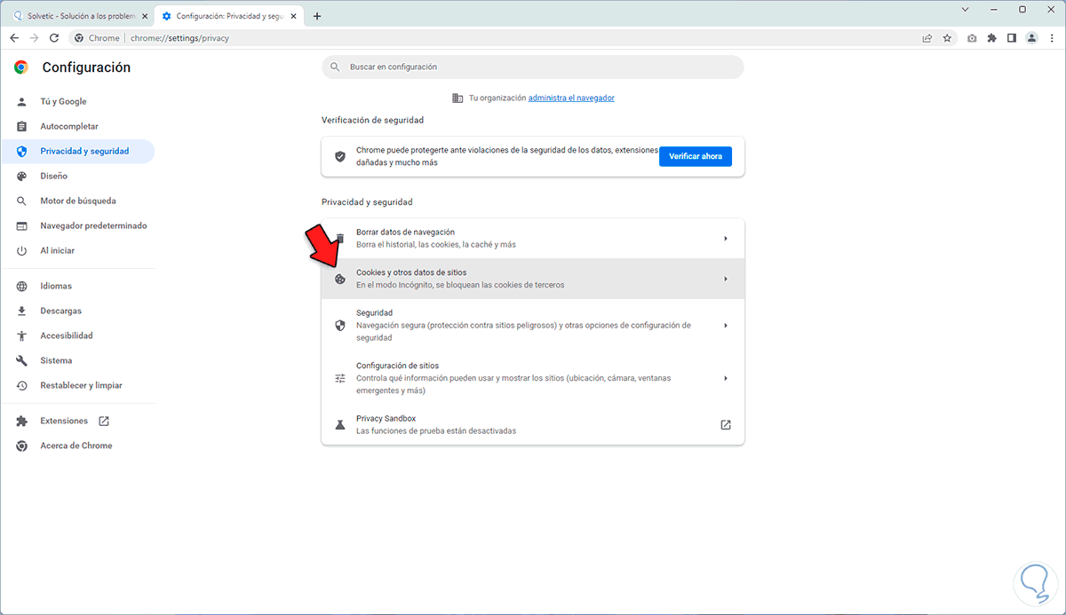 En "Privacidad y seguridad" damos clic en "Cookies y otros datos de sitios":