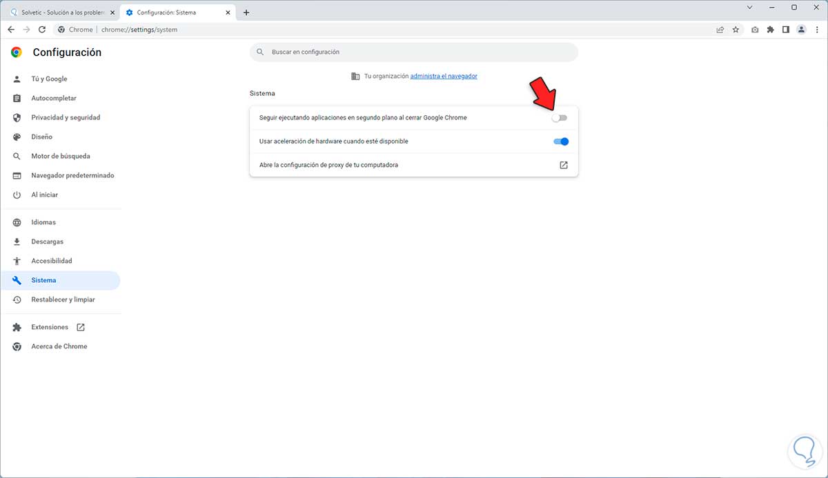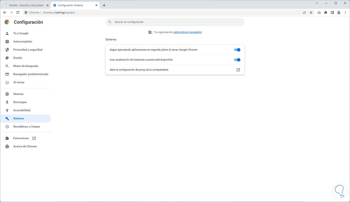 Nota: si el equipo usado no cuenta con buena CPU, RAM y gráficos Solvetic te aconseja desactivar el interruptor “Usar aceleración de hardware cuando esté disponible”.