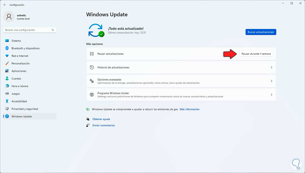 En "Windows Update" damos clic en "Pausar actualizaciones" las cuales por defecto están por una semana: