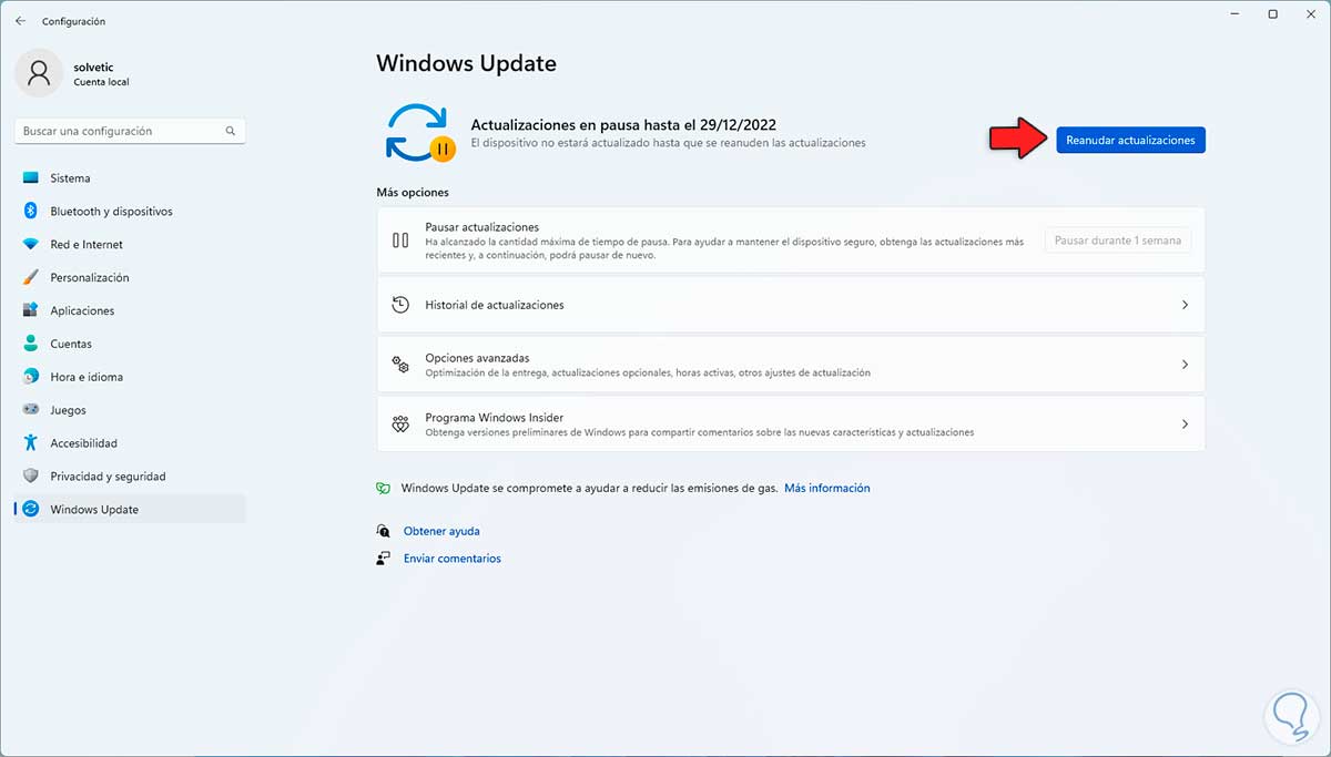 Con esto podemos comprobar si el error de parpadeo de la barra de tareas se debe a las actualizaciones, cuando se requiera activar las actualizaciones damos clic en "reanudar actualizaciones":