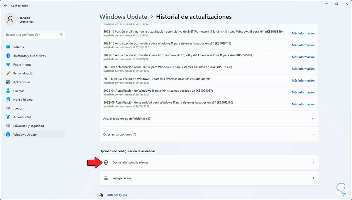 En la parte inferior damos clic en "Desinstalar actualizaciones":