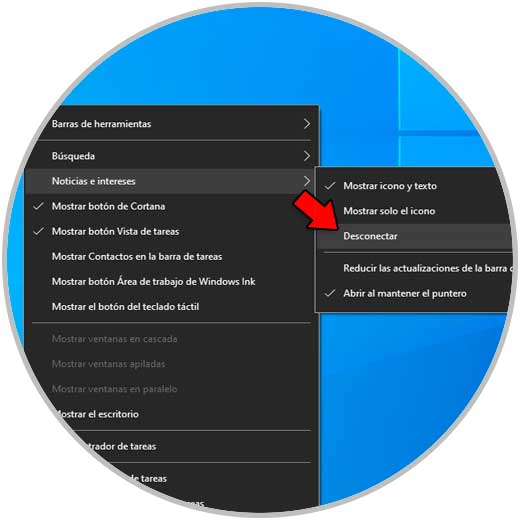 Para desactivarlo damos clic derecho en la barra de tareas y vamos a "Noticias e intereses - Desconectar":